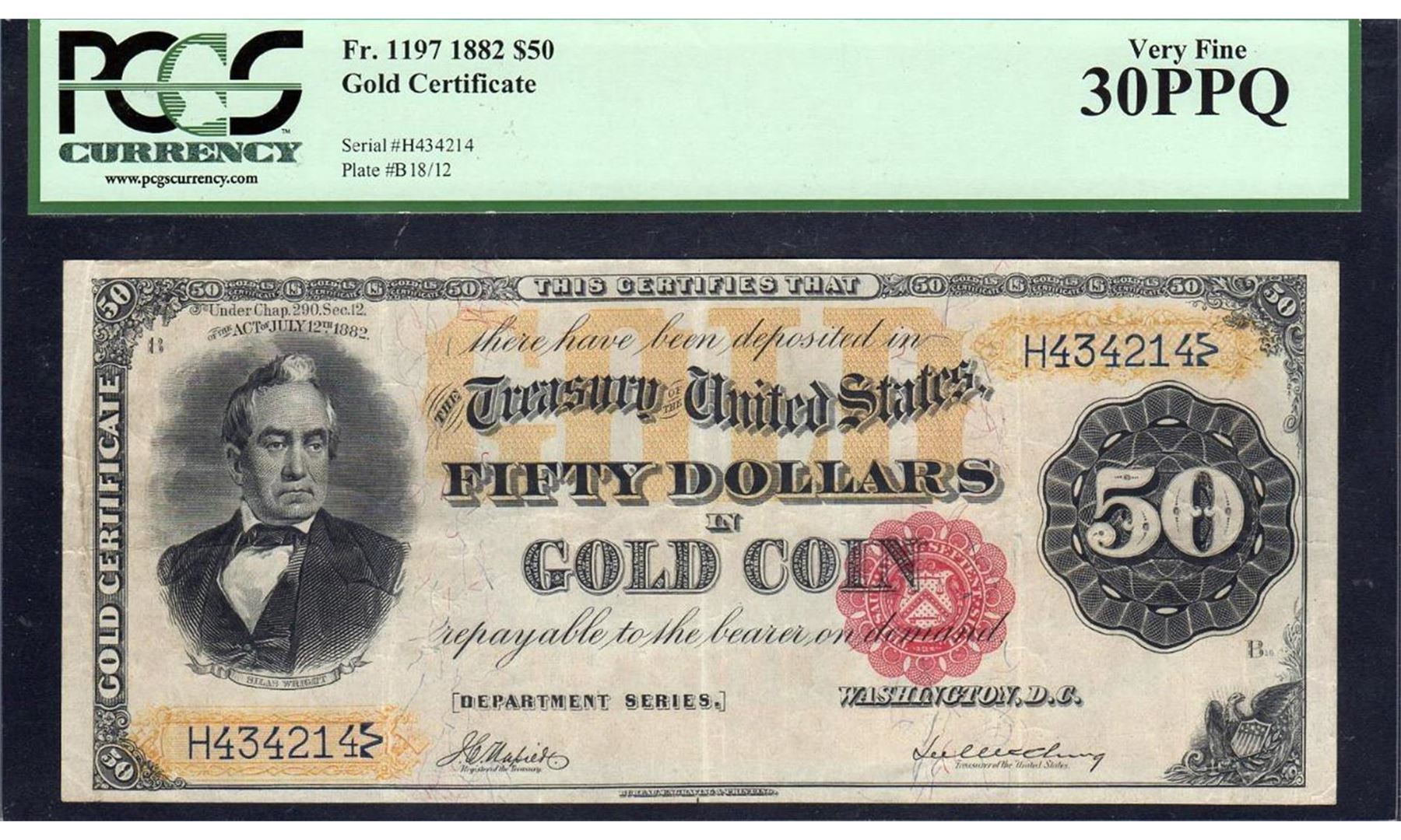 One 1882 $50 Gold Certificate Note Fr.1197 PCGS Very Fine 30PPQ. PCGS Graded.