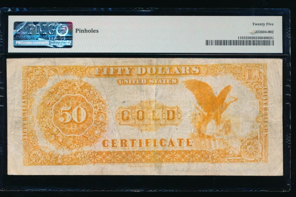 One 1882 $50 Gold Certificate PMG 25.