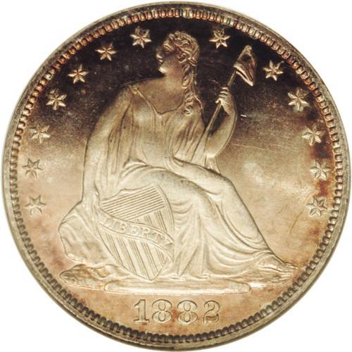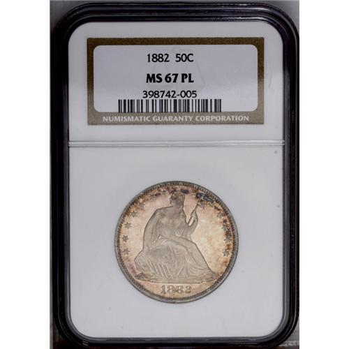 1882 50C MS67 Prooflike NGC. Cherry-red toning endows 1882[50C] MS67 Prooflike NGC.
