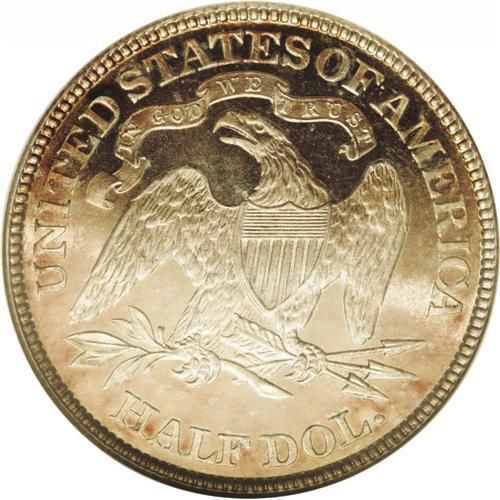 <B>1882<50C> MS67 Prooflike NGC.</B></I> Cherry-red toning endows the flashy fields. Each side has a peripheral glimpse of navy-blue patina. A razor-sharp Superb Gem. A few nearly imperceptible hairlines are noted on the right obverse field. Only 4,400 business strikes were issued, since the mints were occupied with silver dollar production that year.