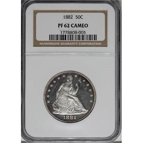 <B>1882 50C PR62 Cameo NGC.</B></I> Impressively thick and consistent frost endows the devices and legends of this needle-sharp specimen. A few inconsequential hairlines determine the grade. Proofs and business strikes combined for only 5,500 pieces.<BR><BR><b>Shipping:</b> Coins & Currency (<a target="_blank" href="http://www.heritageauctions.com/common/shipping.php">view shipping information</a>)
