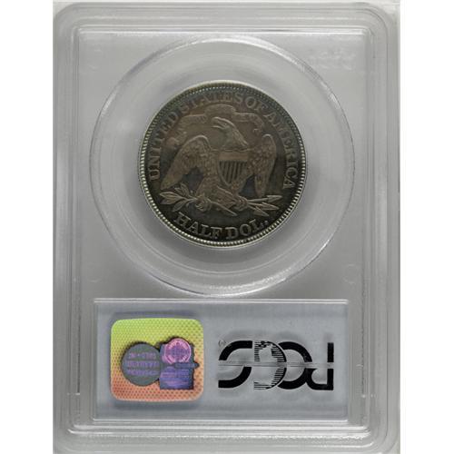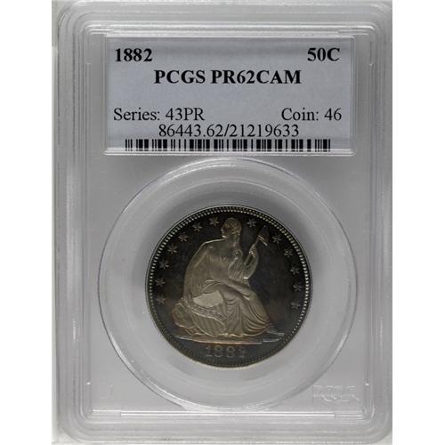 <B>1882<50C> PR62 Cameo PCGS.</B></I> WB-102. Blundered date with tops of 88 hidden in the dentils below the date. If this is a proof-only variety as suggested by Wiley and Bugert, it may be the key to differentiating between proofs and business strikes of this date. This is a delightful original Cameo Proof. The obverse has excellent contrast beneath peripheral shades of deep crimson and electric-blue color. The reverse is mostly toned overall with similar colorations.<BR><I>From The Chief Paduke Collection.</B></I>