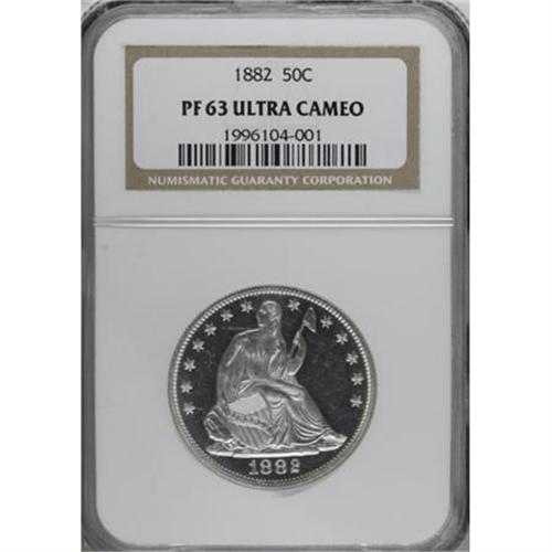 <B>1882 50C PR63 Ultra Cameo NGC.</B></I> This brilliant and crisply struck specimen exhibits remarkable contrast between the frosty devices and the darkly mirrored fields. The reverse is exquisitely preserved, and the obverse field is only moderately hairlined. Census: 1 in 63 Ultra Cameo, 7 finer (8/07).<BR><BR><b>Shipping:</b> Coins & Currency (<a target="_blank" href="http://www.heritageauctions.com/common/shipping.php">view shipping information</a>)