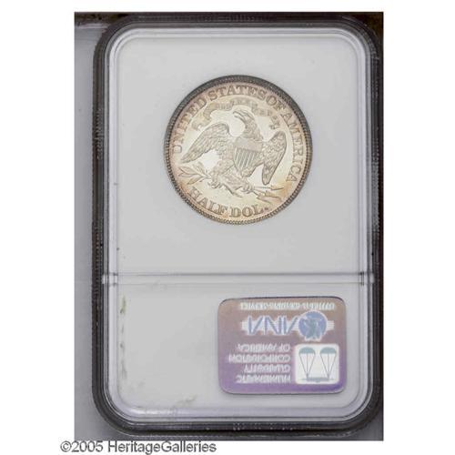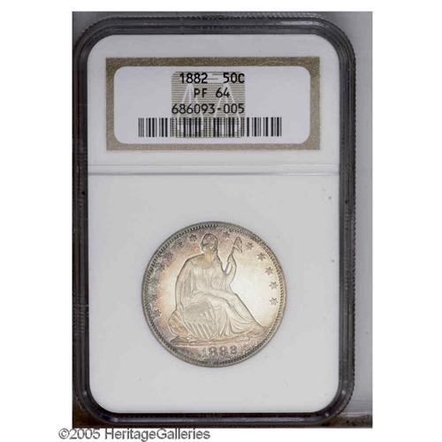 <B>1882<50C> PR64 NGC.</B></I> The central motifs remain mostly untoned with pleasing frost on the devices. The peripheries reveal speckled patina in plum, gold, and burgundy shades. A superb example for the specialist.