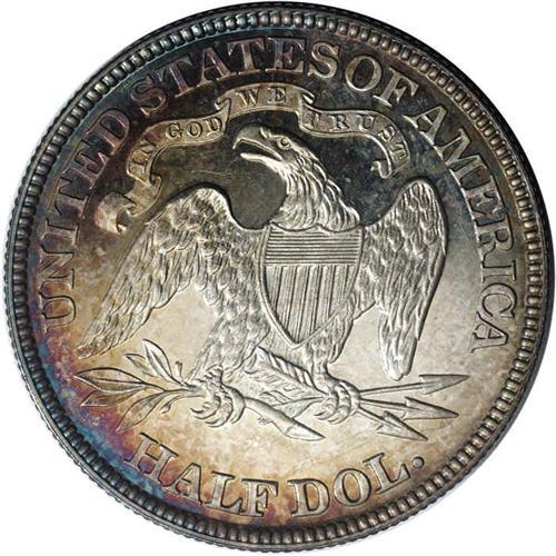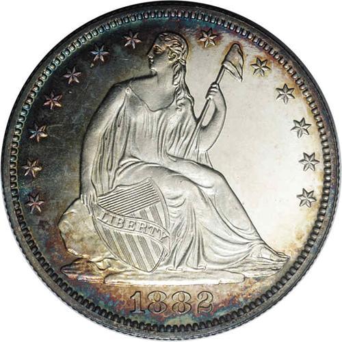 <B>1882<50C> PR65 Cameo NGC.</B></I> This Gem Cameo Proof is a remarkable example of Christian Gobrecht's original Seated Liberty design, having only been through a few minor adjustments. Virtually full design definition, only a touch weak on Liberty's head. Narrow concentric rings of cobalt-blue, lavender, and gold-brown toning gravitates to the rims, and frosty devices offer a striking contrast to the deeply mirrored fields. There are no mentionable abrasions on either side. Wispy die striations, as well as some minor hairlines, are noted in the fields. An extraordinary attractive coin.
