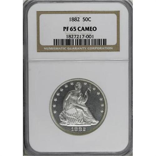 <B>1882 50C PR65 Cameo NGC.</B></I> Icy devices and suitably mirrored fields confirm the Cameo designation. A sharply struck, brilliant, and unabraded Gem. Dimes resumed normal production levels in 1882, but half dollars remained on the Mint back burner. Proofs and business strikes combined for only 5,500 pieces. Census: 9 in 65 Cameo, 15 finer (8/07).<BR><I>From The Mario Eller Collection, Part One.</B></I><BR><BR><b>Shipping:</b> Coins & Currency (<a target="_blank" href="http://www.heritageauctions.com/common/shipping.php">view shipping information</a>)