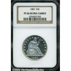 <B>1882<50C> PR66 Deep Cameo NGC.</B></I> This is an impressively well preserved proof Seated Half Dollar. The surfaces are untoned with richly frosted devices that appear to float atop deep, glassy fields. There is not a single noteworthy hairline or contact mark. One of just 5,500 Half Dollars produced in 1882, and important as such. Population: 1 in 65 Deep Cameo, with a mere 3 finer (6/04). <BR><BR><B>Important notice:</B> Heritage usually auctions material at the rate of 200-250 lots per hour. On some occasions eBay Live bid software or the Internet may not be able to keep up with the pace of the auction. We recommend placing a realistic absentee bid now as insurance to avoid disappointment. Occasionally the auctioneer may eliminate or reject an eBay Live bid, and the auctioneer may also reopen a lot after the close of the eBay live bidding (usually because we missed an audience bid), and may reject your bid even if it shows you as the winning bidder. By bidding via eBay Live, you agree that Heritage may award the lot to another bidder at its sole discretion under the circumstances described above or any other reasonable circumstances. Since eBay bids are not shown to us until we open the lot on the floor, we treat those bids just like floor bids. In most cases the floor responds before the eBay bid is presented to us, due to Internet lag time, so for consistency we have made it a policy that floor bids are always considered first over tie eBay live bids. Also please note that all Heritage lots purchased through eBay Live carry a 20% Buyer's Premium. Please make sure you read the Terms and Conditions before you bid. </span></font></tr></table></td></tr></table>