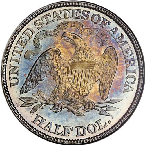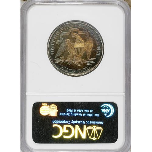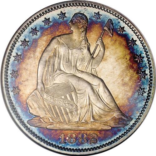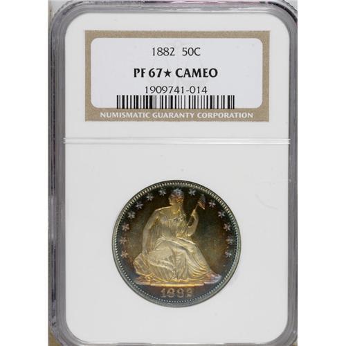<B>1882 50C PR67 <img border='0' src='http://www.heritagecoins.com/images/star.gif' width=10 height=10> Cameo NGC.</B></I> An extraordinary Superb Gem, this piece was given the coveted <img border='0' src='http://www.heritagecoins.com/images/star.gif' width=10 height=10> designation by NGC for its exceptional eye appeal. Both sides have vivid gold toning at the centers, gradually changing to russet, lilac, and light blue color as the borders are approached. A small abrasion in the left obverse field is all that keeps this from an even higher grade. Only three examples of this date have been certified at the PR68 grade level by NGC, including one Cameo and one Ultra Cameo example. Although side-by-side comparison would be necessary to individually rank such pieces, we believe that this piece is among the 10 finest examples of this date, certified or not.<BR><BR><b>Shipping:</b> Coins & Currency (<a target="_blank" href="http://www.heritageauctions.com/common/shipping.php">view shipping information</a>)