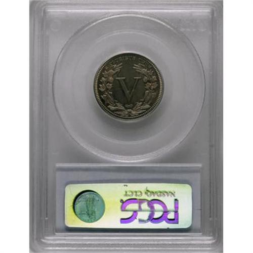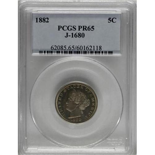 <B>1882 5C Liberty Head Five Cents, Judd-1680, Pollock-1882, Low R.6, PR65 PCGS.</B></I> Liberty's portrait is identical to the adopted design of 1883, but is surrounded by UNITED STATES OF AMERICA instead of stars, and shows the date (1882) below. The border denticles are quite wide. The reverse features a wreath of corn and cotton encircling a large Roman numeral V. The motto E PLURIBUS UNUM is above. Struck in nickel with a plain edge. Deeply mirrored in the fields, the coin is vibrant and attractively toned with lovely golden and lilac patina over each side. <BR><BR><b>Shipping:</b> Coins & Currency (<a target="_blank" href="http://www.heritageauctions.com/common/shipping.php">view shipping information</a>)