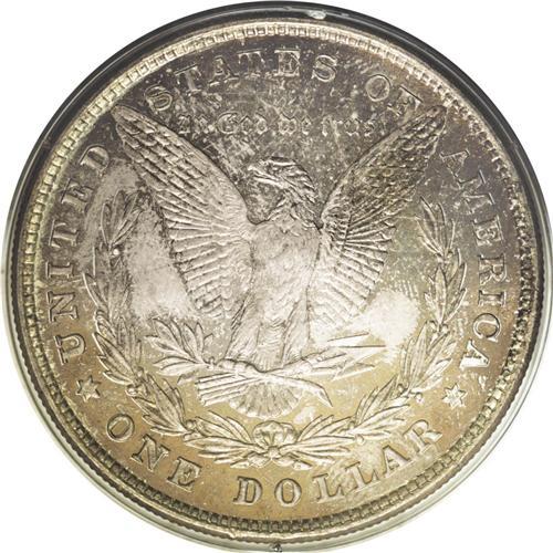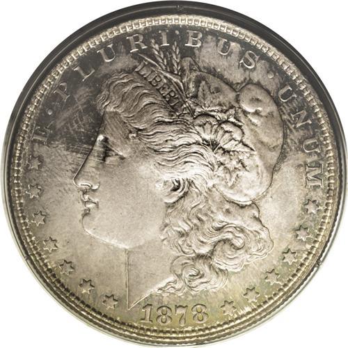 <B>1878 8TF<img border='0' src='http://www.heritagecoins.com/images/star.gif' width=10 height=10>$1>PR66 PCGS</B></I> VAM-14.3. The Eight Tail Feathers proof is extremely popular as the first proof Morgan dollar, coveted alike by type collectors, date collectors, first-year collectors, and others who just like really nice proof coins. Yet it is also decidedly scarce, with less than two dozen total specimens known from the original mintage of 500. Reverse doubling shows at the top of UNITED and the bottom of AMERICA on this variety. Doubling shows on the obverse on many of the stars and the date digits. This example has pretty olive-gray obverse toning that is lighter on the protected areas immediately around the devices, serving in several instances to accentuate the doubling seen. The reverse is hued in copper-gold, and both sides are well struck and have deep, radiant luster under the moderate toning. In a first-generation PCGS holder. Population: 9 in 66, 1 finer (7/06).