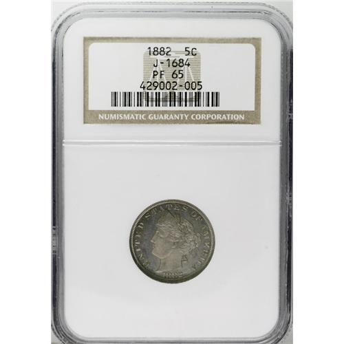 <B>1882 5C Liberty Head Five Cents, Judd-1684, Pollock-1886, Low R.6, PR65 NGC.</B></I> The obverse is similar to that adopted for the regular issue Liberty nickel in 1883, but the legend UNITED STATES OF AMERICA has replaced the stars around the periphery. The reverse depicts a large Roman numeral V within a wreath of corn and cotton with E PLURIBUS UNUM at the top. Struck in nickel with a plain edge. Uniform golden-gray patina smothers the underlying proof finish, which begins to shine through when tilted at an angle.<BR><BR><b>Shipping:</b> Coin/Currency (<a target="_blank" href="http://www.heritageauctions.com/common/shipping.php">view shipping information</a>)