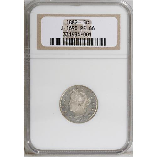 <B>1882 5C Liberty Head Five Cents, Judd-1690, Pollock-1892, R.5, PR66 NGC.</B></I> A transitional pattern nearly identical to the issued 1883 No Cents Liberty nickel. The bust is slightly different in location relative to the stars, and the wreath differs slightly in relation to the peripheral legend, features that are only apparent upon side-by-side comparison. The S in PLURIBUS is widely repunched. Struck in nickel with a plain edge. A well struck Premium Gem with good reflectivity and light milk-gray toning.<BR><BR><b>Shipping:</b> Coin/Currency (<a target="_blank" href="http://www.heritageauctions.com/common/shipping.php">view shipping information</a>)