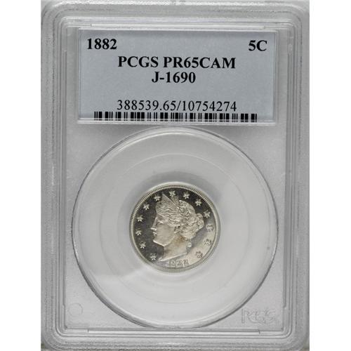 <B>1882 5C Liberty Head Five Cents, Judd-1690, Pollock-1892, R.5, PR65 Cameo PCGS.</B></I> This Liberty nickel pattern closely approximates the issued 1883 No Cents variety, although there are slight differences in the positioning of the devices relative to the stars and peripheral legends. Struck in nickel with a plain edge. A flashy and bold Gem with delicate golden-brown toning. Population: 5 in 65 Cameo, 10 finer (12/06).<BR><BR><b>Shipping:</b> Coins & Currency (<a target="_blank" href="http://www.heritageauctions.com/common/shipping.php">view shipping information</a>)