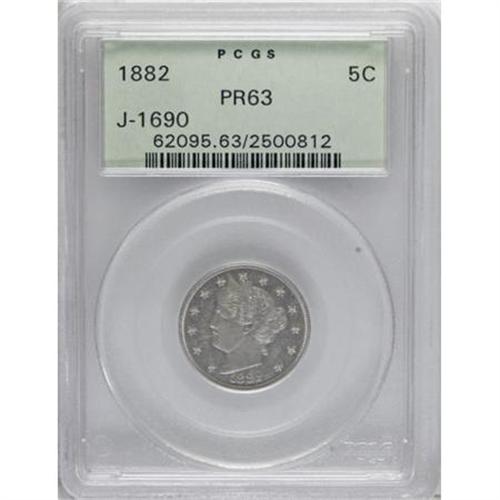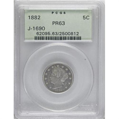 <B>1882 5C Liberty Head Five Cents, Judd-1690, Pollock-1892, R.5, PR63 PCGS.</B></I> A transitional pattern nearly identical to the issued 1883 No Cents Liberty nickel. The bust is slightly different in location relative to the stars, and the wreath differs slightly in relation to the peripheral legend, features that are only apparent upon side-by-side comparison. The S in PLURIBUS is widely repunched. Struck in nickel with a plain edge. A couple of light scrapes on the figure of Liberty limit the grade. Light, hazy blue-gray patina covers each side with strong reflectivity in the fields. <BR><BR><b>Shipping:</b> Coins & Currency (<a target="_blank" href="http://www.heritageauctions.com/common/shipping.php">view shipping information</a>)