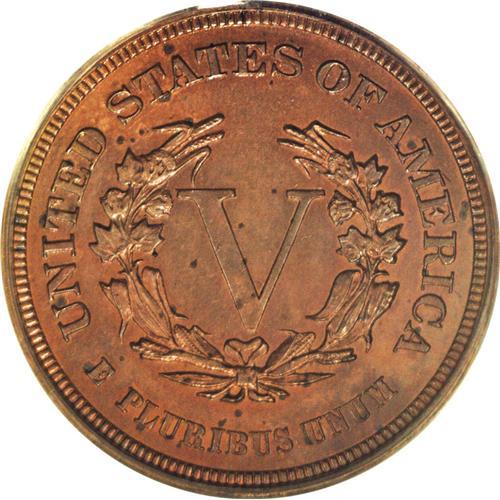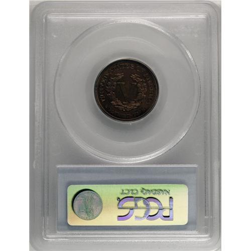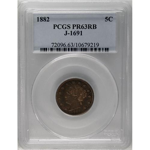 <B>1882<P5C> Liberty Head Five Cents, Judd-1691, Pollock-1893, R.6, PR63 Red and Brown PCGS.</B></I> Ex: John L. Harris Collection. Known as the "Exact Type of 1883," but in reality this pattern differs slightly with a different arrangement of the obverse stars. Still, it is a popular precursor to the adopted Liberty nickel of 1883. Struck in copper with a plain edge. This exceptional Gem has deep shadings of blue and original copper-red over each side. Quite an attractive coin despite numerous speckles of carbon, particularly over the obverse.<BR><I>Ex: John L. Harris Collection (Stack's, 11/50), lot 74.</B></I><BR><I>From The Redfjord Collection.</B></I>
