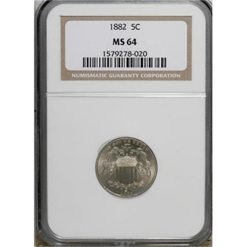 <B>1882 5C MS64 NGC.</B></I> . NGC Census: (261/209). PCGS Population (330/226). Mintage: 11,476,000. Numismedia Wsl. Price for NGC/PCGS coin in MS64: $270. (#3812)<BR><BR><B>Coin Engraver:</B> James B. Longacre<BR><BR><b>Shipping:</b> Coins & Currency (<a target="_blank" href="http://www.heritageauctions.com/common/shipping.php">view shipping information</a>)