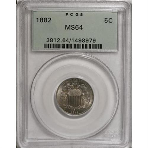 <B>1882 5C MS64 PCGS.</B></I> PCGS Population (329/226). NGC Census: (260/208). Mintage: 11,476,000. Numismedia Wsl. Price for NGC/PCGS coin in MS64: $260. (#3812)<BR><BR><B>Coin Engraver:</B> James B. Longacre<BR><BR><b>Shipping:</b> Coins & Currency (<a target="_blank" href="http://www.heritageauctions.com/common/shipping.php">view shipping information</a>)