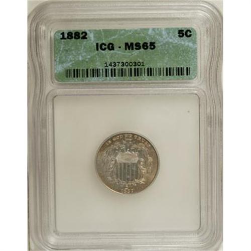 <B>1882 5C MS65 ICG.</B></I> NGC Census: (154/52). PCGS Population (155/70). Mintage: 11,476,000. Numismedia Wsl. Price for NGC/PCGS coin in MS65: $575. (#3812)<BR><BR><b>Shipping:</b> Coins & Currency (<a target="_blank" href="http://www.heritageauctions.com/common/shipping.php">view shipping information</a>)