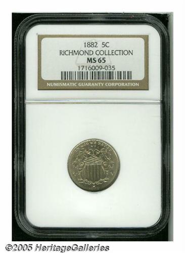 <B>1882<5C> MS65 NGC.</B></I> Ex: Richmond Collection. Champagne-gray lustrous surfaces exhibit sharply struck design features. There are no serious contact marks, and a sole fleck is noted to the upper right (facing) of the shield.