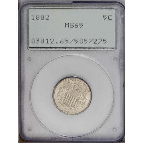 <B>1882<5C> MS65 PCGS.</B></I> Breen-2518. Filled 2. The bright, flashy, untoned surfaces reveal crisply struck design features and the near-absence of post-striking defects. Small die lumps, planchet flaws, striations and die cracks are noted, but these minor mint-made elements are not a bar to the well-deserved Gem grade designation. <BR><BR><B>Important notice:</B> Heritage usually auctions material at the rate of 200-250 lots per hour. On some occasions eBay Live bid software or the Internet may not be able to keep up with the pace of the auction. We recommend placing a realistic absentee bid now as insurance to avoid disappointment. Occasionally the auctioneer may eliminate or reject an eBay Live bid, and the auctioneer may also reopen a lot after the close of the eBay live bidding (usually because we missed an audience bid), and may reject your bid even if it shows you as the winning bidder. By bidding via eBay Live, you agree that Heritage may award the lot to another bidder at its sole discretion under the circumstances described above or any other reasonable circumstances. Since eBay bids are not shown to us until we open the lot on the floor, we treat those bids just like floor bids. In most cases the floor responds before the eBay bid is presented to us, due to Internet lag time, so for consistency we have made it a policy that floor bids are always considered first over tie eBay live bids. Also please note that all Heritage lots purchased through eBay Live carry a 20% Buyer's Premium. Please make sure you read the Terms and Conditions before you bid. This lot is being auctioned in conjunction with a live floor auction by Heritage Galleries & Auctioneers. All final auction and invoice information will be supplied by Heritage Galleries & Auctioneers, and all other information should be considered preliminary. Lot:866 <BR><BR><B>Winning Notification and Billing:</B> After the FINAL session in this auction is complete, Heritage will send e-mail and snail mail invoices. This process normally takes several days. All final auction and invoice information will be supplied by Heritage Galleries & Auctioneers, and all other information should be considered preliminary. <BR><BR>This auction will be conducted on a live auction floor and over the Internet through eBay Live. If you choose to place an absentee bid, please take a moment to <font color='#0000ff'><u><a href='http://pages.ebay.com/liveauctions/help/before/laabsentee.html'>learn how eBay Live absentee bidding works</a></u></font><font color='#000000'>