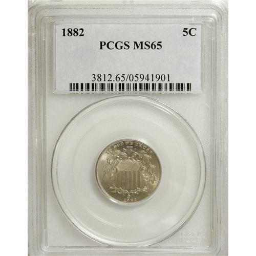 <B>1882 5C MS65 PCGS.</B></I> Dazzling cartwheel luster sweeps this tawny-gold and ice-blue Gem. Well struck except for the date, and void of detectable marks. An attractive representative of this underappreciated type.<BR><BR><b>Shipping:</b> Coins & Currency (<a target="_blank" href="http://www.heritageauctions.com/common/shipping.php">view shipping information</a>)