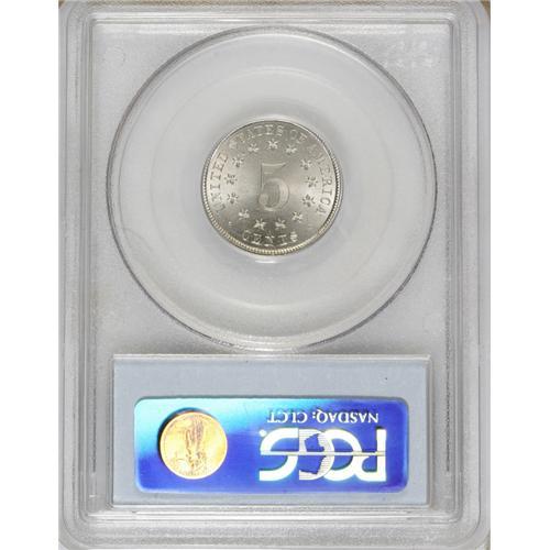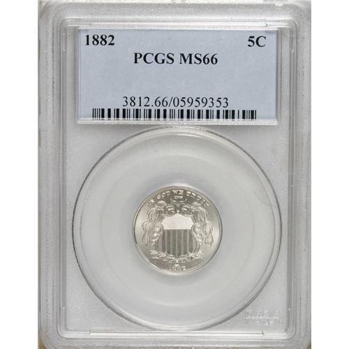 <B>1882 5C MS66 PCGS.</B></I> Light tan patina endows this lustrous and remarkably clean representative. The strike is intricate apart from the centers of the letters in TRUST. A minor strike-through is noted beneath the first S in STATES. The borders exhibit numerous slender die cracks, as made. Population: 65 in 66, 4 finer (2/07).<BR><BR><b>Shipping:</b> Coins & Currency (<a target="_blank" href="http://www.heritageauctions.com/common/shipping.php">view shipping information</a>)
