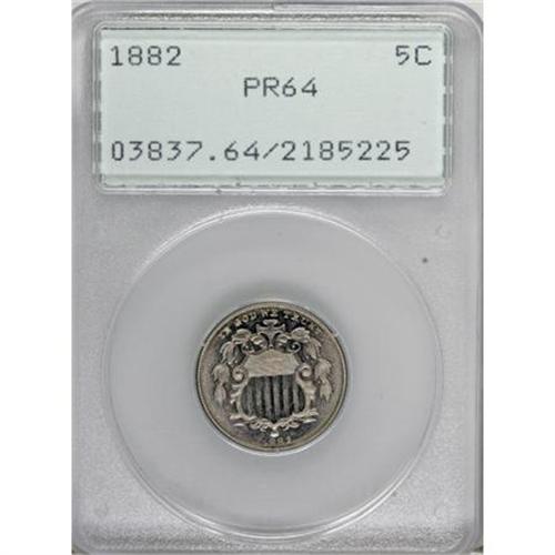 <B>1882 5C PR64 PCGS.</B></I> PCGS Population (199/538). NGC Census: (154/511). Mintage: 3,100. Numismedia Wsl. Price for NGC/PCGS coin in PR64: $332. (#3837)<BR><BR><b>Shipping:</b> Coins & Currency (<a target="_blank" href="http://www.heritageauctions.com/common/shipping.php">view shipping information</a>)