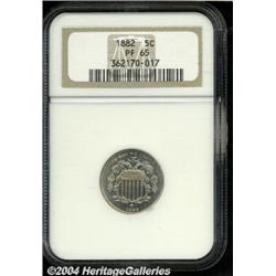 <B>1882<5C> PR65 NGC.</B></I> Speckles of pale lavender cover both sides, showing up most on the moderately reflective fields, against which the mildly frosted devices provide a cameo-like effect. The surfaces are remarkably preserved, and reveal no significant abrasions. <BR><BR><B>Important notice:</B> Heritage usually auctions material at the rate of 200-250 lots per hour. On some occasions eBay Live bid software or the Internet may not be able to keep up with the pace of the auction. We recommend placing a realistic absentee bid now as insurance to avoid disappointment. Occasionally the auctioneer may eliminate or reject an eBay Live bid, and the auctioneer may also reopen a lot after the close of the eBay live bidding (usually because we missed an audience bid), and may reject your bid even if it shows you as the winning bidder. By bidding via eBay Live, you agree that Heritage may award the lot to another bidder at its sole discretion under the circumstances described above or any other reasonable circumstances. Since eBay bids are not shown to us until we open the lot on the floor, we treat those bids just like floor bids. In most cases the floor responds before the eBay bid is presented to us, due to Internet lag time, so for consistency we have made it a policy that floor bids are always considered first over tie eBay live bids. Also please note that all Heritage lots purchased through eBay Live carry a 20% Buyer's Premium. Please make sure you read the Terms and Conditions before you bid.