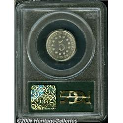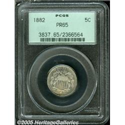 <B>1882 5C PR65 PCGS.</B></I> Blushes of chestnut-gold color invigorate this boldly struck and nearly unabraded Gem. Satin luster sweeps across the fields. A couple of tiny strike-thrus on the reverse are strictly of mint origin. In a green label holder.