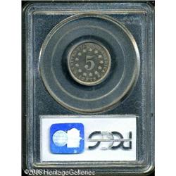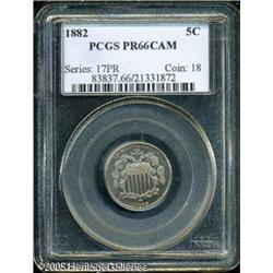 <B>1882 5C PR66 Cameo PCGS.</B></I> Light, original lilac-gray patina covers each side with a dab of golden-brown here and there. Deeply reflective with noticeable contrast even through the moderate toning. Population: 45 in 66, 12 finer (1/05). Lot:5865