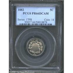 <TR><TD width="100%"><TABLE cellSpacing=1 cellPadding=3 width="100%" border=0><TBODY><TR><TD width="100%" bgColor=#79735c><FONT face=arial color=#ffffff size=3><B>Description</B> </FONT></TD></TR><TR><TD width="100%" bgColor=#ffffff><FONT face=arial size=2><B>1882 5C PR66 Deep Cameo PCGS.</B></I> Mostly brilliant with solid reflectivity and a degree of contrast that is rarely seen on proof Shield Nickels. To illustrate the point, this is the only Deep Cameo of the date certified by PCGS regardless of grade. Population: 1 in 66 Deep Cameo, 0 finer (4/03). </FONT></TD></TR></TBODY></TABLE></TD></TR></TBODY></TABLE><BR><A name=PricesRealized></A><TABLE cellSpacing=0 cellPadding=0 width="100%" bgColor=#000000 border=0><TBODY><TR><TD width="100%"><TABLE cellSpacing=1 cellPadding=3 width="100%" border=0><TBODY><TR><TD width="100%" bgColor=#79735c><A name=PR><FONT face=arial color=#ffffff size=3><B>Previous Prices from Heritage Auctions</B> </FONT></A></TD></TR><TR><TD bgColor=#f6f6ed><TABLE cellSpacing=0 cellPadding=0 width="100%" border=1><TBODY><TR><TD align=middle width="33%"><B>Date</B></TD><TD align=middle width="33%"><B>Service</B></TD><TD align=middle width="33%"><B>Price</B></TD></TR><TR bgColor=whitesmoke><TD width="33%"><B>09/28/2002</B></TD><TD width="33%">PCGS</TD><TD width="33%">$1,552.50</TD></TR></TBODY></TABLE></TD></TR><TR><TD bgColor=#ffffff><FONT face=arial size=1 ?>PLEASE NOTE: All prices realized reflect the final hammer price PLUS the buyer's premium in auctions that charge a buyer's premium. Each item has a notation at the top of the listing indicating whether that lot included a buyer's premium. Example: A item that sells with a final hammer price of $100 and a 20% buyer's premium will display with a price realized of $120. All information listed is intended to be as accurate as possible, but errors are possible. Please use this guide carefully and inform us of any inaccuracies. </FONT></TD></TR></TBODY></TABLE></TD></TR></TBODY></TABLE><BR><TABLE cellSpacing=0 cellPadding=0 width="100%" bgColor=#000000 border=0><TBODY><TR><TD width="100%"><TABLE cellSpacing=1 cellPadding=3 width="100%" border=0><TBODY><TR><TD width="100%" bgColor=#79735c colSpan=6><FONT face=arial color=#ffffff size=3><B>Price Guide*</B> </FONT></TD></TR><TR bgColor=#f6f6ed><TD align=middle><B>Grade</B> </TD><TD align=middle><B>Coin World<BR>(Trends)</B> </TD><TD align=middle><B>Numismedia<BR>Retail</B> </TD><TD align=middle><B>Numismedia<BR>Wholesale</B> </TD><TD align=middle><B>Coin<BR>Universe</B> </TD><TD align=middle><B>Heritage<BR>Value Index</B> </TD></TR><TR bgColor=#ffffff><TD align=middle>65</TD><TD align=right>---</TD><TD align=right>---</TD><TD align=right>---</TD><TD align=right>---</TD><TD align=right>$382.50</TD></TR><TR style="FONT-WEIGHT: bold" bgColor=#cccfdd><TD align=middle>66</TD><TD align=right>---</TD><TD align=right>---</TD><TD align=right>---</TD><TD align=right>---</TD><TD align=right>---</TD></TR><TR bgColor=#ffffff><TD align=middle>67</TD><TD align=right>---</TD><TD align=right>---</TD><TD align=right>---</TD><TD align=right>---</TD><TD align=right>---</TD></TR><TR bgColor=#ffffff><TD colSpan=6><FONT size=1>*All information listed is intended to be as accurate as possible, but errors are possible. No item may be returned or refused based on this information which is provided as a service to our customers. You should contact each pricing source directly to determine the accuracy of this information. </FONT></TD></TR></TBODY></TABLE></TD></TR></TBODY></TABLE><BR><TABLE cellSpacing=0 cellPadding=0 width="100%" bgColor=#000000 border=0><TBODY><TR><TD width="100%"><TABLE cellSpacing=1 cellPadding=3 width="100%" border=0><TBODY><TR><TD width="100%" bgColor=#79735c><FONT face=arial color=#ffffff size=3><B>Population Guide</B> </FONT></TD></TR><TR bgColor=#ffffff><TD align=middle><!-- Begin Output of Population Grid--><TABLE cellSpacing=0 cellPadding=0 width="100%" border=0><TBODY><TR><TD vAlign=center><TABLE cellSpacing=0 width="100%" border=1 cellsadding="3"><TBODY><TR><TD vAlign=center><TABLE cellSpacing=0 cellPadding=3 width="100%" border=1><TBODY><TR><TD vAlign=center align=middle bgColor=#f0f1e8 colSpan=2 <CENTER><FONT face=Arial size=2><B>PCGS Pop </B></FONT><CENTER></CENTER></TD><TD vAlign=center align=middle bgColor=#f0f1e8 colSpan=2><CENTER><FONT face=Arial size=2><B>NGC Pop</B></CENTER></FONT></TD></TR><TR><TD vAlign=center><FONT face=Arial size=2>(66)</FONT> </TD><TD vAlign=center align=right><FONT face=Arial size=2>1</FONT> </TD><TD vAlign=center><FONT face=Arial size=2>(66)</FONT> </TD><TD vAlign=center align=right><FONT face=Arial size=2>0</FONT> </TD></TR><TR><TD vAlign=center><FONT face=Arial size=2>(>66)</FONT> </TD><TD vAlign=center align=right><FONT face=Arial size=2>0</FONT> </TD><TD vAlign=center><FONT face=Arial size=2>(>66)</FONT> </TD><TD vAlign=center align=right><FONT face=Arial size=2>0</FONT> </TD></TR></TBODY></TABLE></TD></TR></TBODY></TABLE></TD></TR></TBODY></TABLE><!-- End Output of Population Grid--></TD></TR></TBODY></TABLE></TD></TR></TBODY></TABLE><BR><TABLE cellSpacing=0 cellPadding=0 width="100%" bgColor=#000000 border=0><TBODY><TR> Important notice: We expect to be auctioning lots at the rate of 200-250 per hour. On occasion eBay live bid software cannot keep up with the pace of the auctions where 4-5 lots per minute can hammer down, so we recommend that you place a realistic absentee bid now as insurance to avoid disappointment. Also please note that all Heritage/CAA lots purchased through eBay Live carry a 20% Buyer's Premium. Please make sure you read the Terms and Conditions.