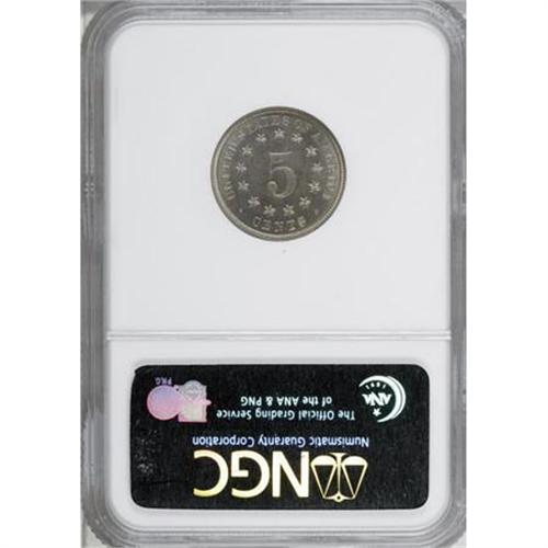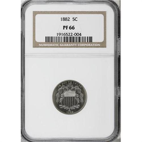 <B>1882 5C PR66 NGC.</B></I> Faint ice-blue and beige patina graces both sides of this sharply struck proof Shield nickel. Despite the patina, the obverse displays a noteworthy cameo effect. NGC has graded just 38 numerically finer specimens (3/08).<BR><BR><B>Coin Engraver:</B> James B. Longacre<BR><BR><b>Shipping:</b> Coins & Currency (<a target="_blank" href="http://www.heritageauctions.com/common/shipping.php">view shipping information</a>)