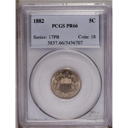 <B>1882<5C> PR66 PCGS.</B></I> Both sides are pleasingly reflective with soft reddish-golden overtones. This is an attractive representative of the type. <BR><BR><B>Important notice:</B> Heritage usually auctions material at the rate of 200-250 lots per hour. On some occasions eBay Live bid software or the Internet may not be able to keep up with the pace of the auction. We recommend placing a realistic absentee bid now as insurance to avoid disappointment. Occasionally the auctioneer may eliminate or reject an eBay Live bid, and the auctioneer may also reopen a lot after the close of the eBay live bidding (usually because we missed an audience bid), and may reject your bid even if it shows you as the winning bidder. By bidding via eBay Live, you agree that Heritage may award the lot to another bidder at its sole discretion under the circumstances described above or any other reasonable circumstances. Since eBay bids are not shown to us until we open the lot on the floor, we treat those bids just like floor bids. In most cases the floor responds before the eBay bid is presented to us, due to Internet lag time, so for consistency we have made it a policy that floor bids are always considered first over tie eBay live bids. Also please note that all Heritage lots purchased through eBay Live carry a 20% Buyer's Premium. Please make sure you read the Terms and Conditions before you bid. This lot is being auctioned in conjunction with a live floor auction by Heritage Galleries & Auctioneers. All final auction and invoice information will be supplied by Heritage Galleries & Auctioneers, and all other information should be considered preliminary. Lot:901 <BR><BR><B>Winning Notification and Billing:</B> After the FINAL session in this auction is complete, Heritage will send e-mail and snail mail invoices. This process normally takes several days. All final auction and invoice information will be supplied by Heritage Galleries & Auctioneers, and all other information should be considered preliminary. <BR><BR>This auction will be conducted on a live auction floor and over the Internet through eBay Live. If you choose to place an absentee bid, please take a moment to <font color='#0000ff'><u><a href='http://pages.ebay.com/liveauctions/help/before/laabsentee.html'>learn how eBay Live absentee bidding works</a></u></font><font color='#000000'>