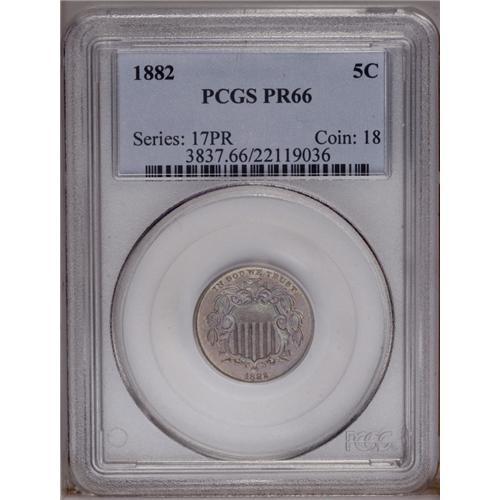 <B>1882<5C> PR66 PCGS.</B></I> Plum and autumn-brown tints enrich this meticulously struck and undisturbed Premium Gem. A beautiful type coin with flashy fields and irrefutable eye appeal.