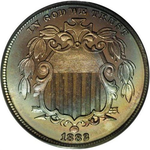 <B>1882<5C> PR67 Cameo PCGS.</B></I> An absolutely stunning Superb Cameo proof with deeply mirrored fields and lustrous devices. Both sides have attractive blue-gray coloration with intense rainbow toning. Tied for the finest example certified by either PCGS or NGC. Population: 12 in 67, 0 finer (3/06). <BR><BR><B>Important notice:</B> Heritage usually auctions material at the rate of 200-250 lots per hour. On some occasions eBay Live bid software or the Internet may not be able to keep up with the pace of the auction. We recommend placing a realistic absentee bid now as insurance to avoid disappointment. Occasionally the auctioneer may eliminate or reject an eBay Live bid, and the auctioneer may also reopen a lot after the close of the eBay live bidding (usually because we missed an audience bid), and may reject your bid even if it shows you as the winning bidder. By bidding via eBay Live, you agree that Heritage may award the lot to another bidder at its sole discretion under the circumstances described above or any other reasonable circumstances. Since eBay bids are not shown to us until we open the lot on the floor, we treat those bids just like floor bids. In most cases the floor responds before the eBay bid is presented to us, due to Internet lag time, so for consistency we have made it a policy that floor bids are always considered first over tie eBay live bids. Also please note that all Heritage lots purchased through eBay Live carry a 20% Buyer's Premium. Please make sure you read the Terms and Conditions before you bid. This lot is being auctioned in conjunction with a live floor auction by Heritage Galleries & Auctioneers. All final auction and invoice information will be supplied by Heritage Galleries & Auctioneers, and all other information should be considered preliminary. Lot:904 <BR><BR><B>Winning Notification and Billing:</B> After the FINAL session in this auction is complete, Heritage will send e-mail and snail mail invoices. This process normally takes several days. All final auction and invoice information will be supplied by Heritage Galleries & Auctioneers, and all other information should be considered preliminary. <BR><BR>This auction will be conducted on a live auction floor and over the Internet through eBay Live. If you choose to place an absentee bid, please take a moment to <font color='#0000ff'><u><a href='http://pages.ebay.com/liveauctions/help/before/laabsentee.html'>learn how eBay Live absentee bidding works</a></u></font><font color='#000000'>