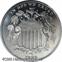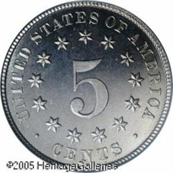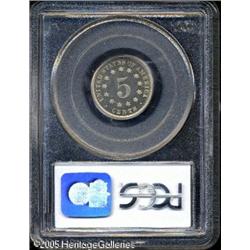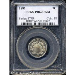 <B>1882 5C PR67 Cameo PCGS.</B></I> This boldly struck Gem has pleasing white on black contrast and a hint of golden-tan patina. The first 8 in the date shows minor recutting within the lower loop. A remarkably well preserved specimen and currently unsurpassable in grade. Population: 12 in 67, none finer at either service (1/05). Lot:5866