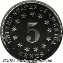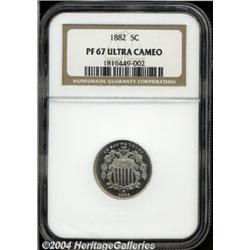 <B>1882<5C> PR67 Deep Cameo NGC.</B></I> This is a gorgeous proof whose frosty, sharp looking devices rise boldly above the bright fields. No blemishes of note on either side of this Deep Cameo Superb Proof specimen. This is tied with one other example at PCGS as the finest Deep Cameo '82 Shield Nickel (7/04). <BR><BR><B>Important notice:</B> Heritage usually auctions material at the rate of 200-250 lots per hour. On some occasions eBay Live bid software or the Internet may not be able to keep up with the pace of the auction. We recommend placing a realistic absentee bid now as insurance to avoid disappointment. Occasionally the auctioneer may eliminate or reject an eBay Live bid, and the auctioneer may also reopen a lot after the close of the eBay live bidding (usually because we missed an audience bid), and may reject your bid even if it shows you as the winning bidder. By bidding via eBay Live, you agree that Heritage may award the lot to another bidder at its sole discretion under the circumstances described above or any other reasonable circumstances. Since eBay bids are not shown to us until we open the lot on the floor, we treat those bids just like floor bids. In most cases the floor responds before the eBay bid is presented to us, due to Internet lag time, so for consistency we have made it a policy that floor bids are always considered first over tie eBay live bids. Also please note that all Heritage lots purchased through eBay Live carry a 20% Buyer's Premium. Please make sure you read the Terms and Conditions before you bid. </span></font></tr></table></td></tr></table>