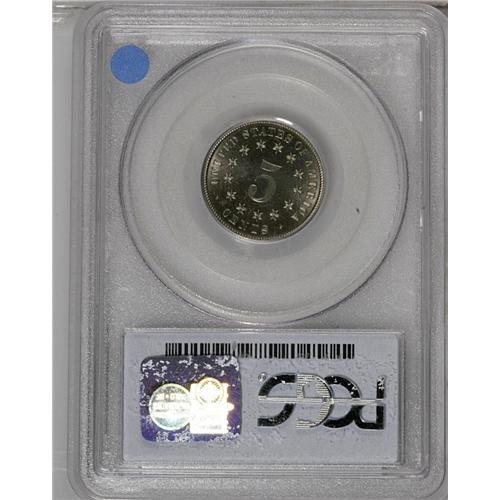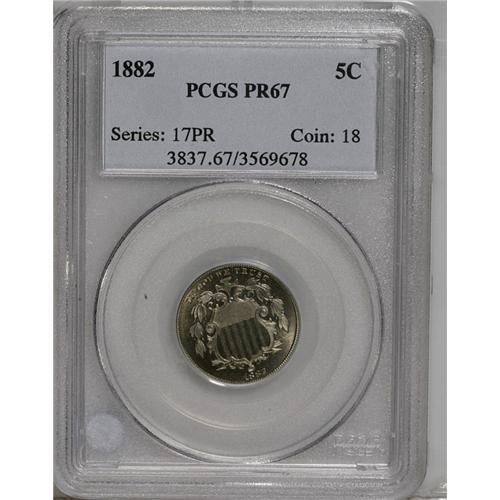 <B>1882<5C> PR67 PCGS.</B></I> A glittering Superb Gem with pale blue and emerald toning over watery mirrors. The bold strike has brought out a wealth of detail. Population: 39 in 67, 1 finer (6/06).