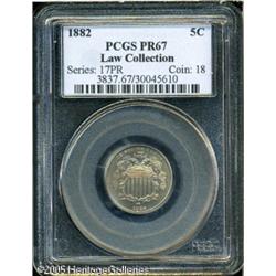 <B>1882 5C PR67 PCGS.</B></I> Ex: Law Collection. Nicely struck, with a thin veneer of champagne color. There are no serious marks to report. Population: 39 in 67, 1 finer (1/05). Lot:5863