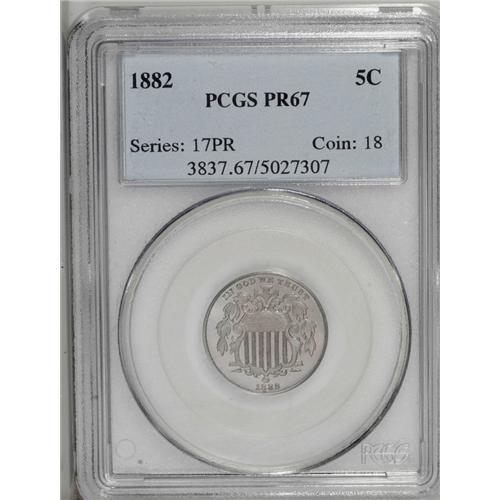 <B>1882<5C> PR67 PCGS.</B></I> Pastel peach, olive, and steel-blue patina. A well struck and virtually immaculate Superb Gem. An outstanding and nearly unimprovable representative of this penultimate proof issue. Population: 39 in 67, 1 finer (7/06).<BR><I>From The Troy Wiseman Collection.</B></I>