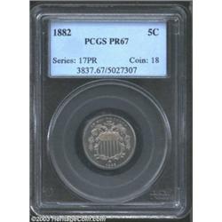 <TABLE cellSpacing=0 cellPadding=0 width="100%" bgColor=#000000 border=0><TBODY><TR><TD width="100%"><TABLE cellSpacing=1 cellPadding=3 width="100%" border=0><TBODY><TR><TD width="100%" bgColor=#79735c><FONT face=arial color=#ffffff size=3><B>Description</B> </FONT></TD></TR><TR><TD width="100%" bgColor=#ffffff><FONT face=arial size=2><B>1882 5C PR67 PCGS.</B></I> Pastel peach, olive, and steel-blue patina. A well struck and virtually immaculate Superb Gem. An outstanding and nearly unimprovable representative of this penultimate proof issue. Population: 40 in 67, 1 finer (4/03). </FONT></TD></TR></TBODY></TABLE></TD></TR></TBODY></TABLE><BR><A name=PricesRealized></A><TABLE cellSpacing=0 cellPadding=0 width="100%" bgColor=#000000 border=0><TBODY><TR><TD width="100%"><TABLE cellSpacing=1 cellPadding=3 width="100%" border=0><TBODY><TR><TD width="100%" bgColor=#79735c><A name=PR><FONT face=arial color=#ffffff size=3><B>Previous Prices from Heritage Auctions</B> </FONT></A></TD></TR><TR><TD bgColor=#f6f6ed><TABLE cellSpacing=0 cellPadding=0 width="100%" border=1><TBODY><TR><TD align=middle width="33%"><B>Date</B></TD><TD align=middle width="33%"><B>Service</B></TD><TD align=middle width="33%"><B>Price</B></TD></TR><TR bgColor=whitesmoke><TD width="33%"><B>01/05/2001</B></TD><TD width="33%">PCGS</TD><TD width="33%">$1,495.00</TD></TR><TR bgColor=whitesmoke><TD width="33%"><B>10/04/1997</B></TD><TD width="33%">PCGS</TD><TD width="33%">$1,320.00</TD></TR><TR bgColor=whitesmoke><TD width="33%"><B>09/01/1999</B></TD><TD width="33%">PCGS</TD><TD width="33%">$1,495.00</TD></TR><TR bgColor=whitesmoke><TD width="33%"><B>03/23/2003</B></TD><TD width="33%">NGC</TD><TD width="33%">$1,322.50</TD></TR><TR bgColor=whitesmoke><TD width="33%"><B>07/29/2003</B></TD><TD width="33%">PCGS</TD><TD width="33%">$1,840.00</TD></TR><TR bgColor=whitesmoke><TD width="33%"><B>05/01/1995</B></TD><TD width="33%">NGC</TD><TD width="33%">$1,760.00</TD></TR></TBODY></TABLE></TD></TR><TR><TD bgColor=#ffffff><FONT face=arial size=1 ?>PLEASE NOTE: All prices realized reflect the final hammer price PLUS the buyer's premium in auctions that charge a buyer's premium. Each item has a notation at the top of the listing indicating whether that lot included a buyer's premium. Example: A item that sells with a final hammer price of $100 and a 20% buyer's premium will display with a price realized of $120. All information listed is intended to be as accurate as possible, but errors are possible. Please use this guide carefully and inform us of any inaccuracies. </FONT></TD></TR></TBODY></TABLE></TD></TR></TBODY></TABLE><BR><TABLE cellSpacing=0 cellPadding=0 width="100%" bgColor=#000000 border=0><TBODY><TR><TD width="100%"><TABLE cellSpacing=1 cellPadding=3 width="100%" border=0><TBODY><TR><TD width="100%" bgColor=#79735c colSpan=6><FONT face=arial color=#ffffff size=3><B>Price Guide*</B> </FONT></TD></TR><TR bgColor=#f6f6ed><TD align=middle><B>Grade</B> </TD><TD align=middle><B>Coin World<BR>(Trends)</B> </TD><TD align=middle><B>Numismedia<BR>Retail</B> </TD><TD align=middle><B>Numismedia<BR>Wholesale</B> </TD><TD align=middle><B>Coin<BR>Universe</B> </TD><TD align=middle><B>Heritage<BR>Value Index</B> </TD></TR><TR bgColor=#ffffff><TD align=middle>66</TD><TD align=right>---</TD><TD align=right>---</TD><TD align=right>$775.00</TD><TD align=right>$950.00</TD><TD align=right>$645.00</TD></TR><TR style="FONT-WEIGHT: bold" bgColor=#cccfdd><TD align=middle>67</TD><TD align=right>---</TD><TD align=right>---</TD><TD align=right>$1,675.00</TD><TD align=right>$3,250.00</TD><TD align=right>$1,798.75</TD></TR><TR bgColor=#ffffff><TD align=middle>68</TD><TD align=right>---</TD><TD align=right>---</TD><TD align=right>---</TD><TD align=right>---</TD><TD align=right>---</TD></TR><TR bgColor=#ffffff><TD colSpan=6><FONT size=1>*All information listed is intended to be as accurate as possible, but errors are possible. No item may be returned or refused based on this information which is provided as a service to our customers. You should contact each pricing source directly to determine the accuracy of this information. </FONT></TD></TR></TBODY></TABLE></TD></TR></TBODY></TABLE><BR><TABLE cellSpacing=0 cellPadding=0 width="100%" bgColor=#000000 border=0><TBODY><TR><TD width="100%"><TABLE cellSpacing=1 cellPadding=3 width="100%" border=0><TBODY><TR><TD width="100%" bgColor=#79735c><FONT face=arial color=#ffffff size=3><B>Population Guide</B> </FONT></TD></TR><TR bgColor=#ffffff><TD align=middle><!-- Begin Output of Population Grid--><TABLE cellSpacing=0 cellPadding=0 width="100%" border=0><TBODY><TR><TD vAlign=center><TABLE cellSpacing=0 width="100%" border=1 cellsadding="3"><TBODY><TR><TD vAlign=center><TABLE cellSpacing=0 cellPadding=3 width="100%" border=1><TBODY><TR><TD vAlign=center align=middle bgColor=#f0f1e8 colSpan=2 <CENTER><FONT face=Arial size=2><B>PCGS Pop </B></FONT><CENTER></CENTER></TD><TD vAlign=center align=middle bgColor=#f0f1e8 colSpan=2><CENTER><FONT face=Arial size=2><B>NGC Pop</B></CENTER></FONT></TD></TR><TR><TD vAlign=center><FONT face=Arial size=2>(67)</FONT> </TD><TD vAlign=center align=right><FONT face=Arial size=2>42</FONT> </TD><TD vAlign=center><FONT face=Arial size=2>(67)</FONT> </TD><TD vAlign=center align=right><FONT face=Arial size=2>30</FONT> </TD></TR><TR><TD vAlign=center><FONT face=Arial size=2>(>67)</FONT> </TD><TD vAlign=center align=right><FONT face=Arial size=2>1</FONT> </TD><TD vAlign=center><FONT face=Arial size=2>(>67)</FONT> </TD><TD vAlign=center align=right><FONT face=Arial size=2>1</FONT> </TD></TR></TBODY></TABLE></TD></TR></TBODY></TABLE></TD></TR></TBODY></TABLE><!-- End Output of Population Grid--> Important notice: Heritage usually auctions material at the rate of 200-250 lots per hour. On some occasions eBay Live bid software or the Internet may not be able to keep up with the pace of the auction. We recommend placing a realistic absentee bid now as insurance to avoid disappointment. Occasionally the