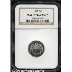 <B>1882<5C> PR67 Ultra Cameo NGC.</B></I> Fully brilliant and as fresh as the day it was struck. The fields are deeply reflective, the devices heavily frosted resulting in a remarkable two-toned effect. Unsurpassable quality in a Superb Gem Proof Shield Nickel. <BR><BR><B>Important notice:</B> Heritage usually auctions material at the rate of 200-250 lots per hour. On some occasions eBay Live bid software or the Internet may not be able to keep up with the pace of the auction. We recommend placing a realistic absentee bid now as insurance to avoid disappointment. Occasionally the auctioneer may eliminate or reject an eBay Live bid, and the auctioneer may also reopen a lot after the close of the eBay live bidding (usually because we missed an audience bid), and may reject your bid even if it shows you as the winning bidder. By bidding via eBay Live, you agree that Heritage may award the lot to another bidder at its sole discretion under the circumstances described above or any other reasonable circumstances. Since eBay bids are not shown to us until we open the lot on the floor, we treat those bids just like floor bids. In most cases the floor responds before the eBay bid is presented to us, due to Internet lag time, so for consistency we have made it a policy that floor bids are always considered first over tie eBay live bids. Also please note that all Heritage lots purchased through eBay Live carry a 20% Buyer's Premium. Please make sure you read the Terms and Conditions before you bid.