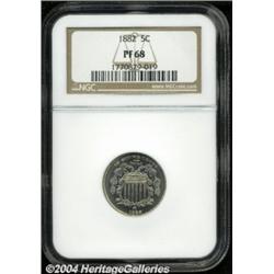 <table><tbody><tr><td><table> <TR><TD width="100%"><TABLE cellSpacing=1 cellPadding=3 width="100%" border=0><TBODY><TR><TD width="100%" bgColor=#79735c><FONT face=arial color=#ffffff size=3><B>Description</B> </FONT></TD></TR><TR><TD width="100%" bgColor=#ffffff><FONT face=arial size=2><B>1882 5C PR68 NGC.</B></I> An extraordinary proof Shield Nickel that looks essentially as it did when it came off the dies. The sparkling, untoned surfaces are totally free from hairlines, carbon, or haziness, being struck with pinpoint sharpness in all areas. If the ultimate proof type coin is your goal, the search for the Shield Nickel representative may well be over. Population: 3 in 68, 0 finer (11/03). </FONT></TD></TR></TBODY></TABLE></TD></TR></TBODY></TABLE><BR><A name=PricesRealized></A><TABLE cellSpacing=0 cellPadding=0 width="100%" bgColor=#000000 border=0><TBODY><TR><TD width="100%"><TABLE cellSpacing=1 cellPadding=3 width="100%" border=0><TBODY><TR><TD width="100%" bgColor=#79735c><A name=PR><FONT face=arial color=#ffffff size=3><B>Previous Prices from Heritage Auctions</B> </FONT></A></TD></TR><TR><TD bgColor=#f6f6ed>No Prior Data Recorded </TD></TR><TR><TD bgColor=#ffffff><FONT face=arial size=1 ?>PLEASE NOTE: All prices realized reflect the final hammer price PLUS the buyer's premium in auctions that charge a buyer's premium. Each item has a notation at the top of the listing indicating whether that lot included a buyer's premium. Example: A item that sells with a final hammer price of $100 and a 20% buyer's premium will display with a price realized of $120. All information listed is intended to be as accurate as possible, but errors are possible. Please use this guide carefully and inform us of any inaccuracies. </FONT></TD></TR></TBODY></TABLE></TD></TR></TBODY></TABLE><BR><TABLE cellSpacing=0 cellPadding=0 width="100%" bgColor=#000000 border=0><TBODY><TR><TD width="100%"><TABLE cellSpacing=1 cellPadding=3 width="100%" border=0><TBODY><TR><TD width="100%" bgColor=#79735c colSpan=6><FONT face=arial color=#ffffff size=3><B>Price Guide*</B> </FONT></TD></TR><TR bgColor=#f6f6ed><TD align=middle><B>Grade</B> </TD><TD align=middle><B>Coin World<BR>(Trends)</B> </TD><TD align=middle><B>Numismedia<BR>Retail</B> </TD><TD align=middle><B>Numismedia<BR>Wholesale</B> </TD><TD align=middle><B>Coin<BR>Universe</B> </TD><TD align=middle><B>Heritage<BR>Value Index</B> </TD></TR><TR bgColor=#ffffff><TD align=middle>67</TD><TD align=right>---</TD><TD align=right>---</TD><TD align=right>$1,675.00</TD><TD align=right>$3,500.00</TD><TD align=right>$2,100.00</TD></TR><TR style="FONT-WEIGHT: bold" bgColor=#cccfdd><TD align=middle>68</TD><TD align=right>---</TD><TD align=right>---</TD><TD align=right>---</TD><TD align=right>---</TD><TD align=right>---</TD></TR><TR bgColor=#ffffff><TD align=middle>69</TD><TD align=right>---</TD><TD align=right>---</TD><TD align=right>---</TD><TD align=right>---</TD><TD align=right>---</TD></TR><TR bgColor=#ffffff><TD colSpan=6><FONT size=1>*All information listed is intended to be as accurate as possible, but errors are possible. No item may be returned or refused based on this information which is provided as a service to our customers. You should contact each pricing source directly to determine the accuracy of this information. </FONT></TD></TR></TBODY></TABLE></TD></TR></TBODY></TABLE><BR><TABLE cellSpacing=0 cellPadding=0 width="100%" bgColor=#000000 border=0><TBODY><TR><TD width="100%"><TABLE cellSpacing=1 cellPadding=3 width="100%" border=0><TBODY><TR><TD width="100%" bgColor=#79735c><FONT face=arial color=#ffffff size=3><B>Population Guide</B> </FONT></TD></TR><TR bgColor=#ffffff><TD align=middle><!-- Begin Output of Population Grid--><TABLE cellSpacing=0 cellPadding=0 width="100%" border=0><TBODY><TR><TD vAlign=center><TABLE cellSpacing=0 width="100%" border=1 cellsadding="3"><TBODY><TR><TD vAlign=center><TABLE cellSpacing=0 cellPadding=3 width="100%" border=1><TBODY><TR><TD vAlign=center align=middle bgColor=#f0f1e8 colSpan=2 <CENTER><FONT face=Arial size=2><B>PCGS Pop </B></FONT><CENTER></CENTER></TD><TD vAlign=center align=middle bgColor=#f0f1e8 colSpan=2><CENTER><FONT face=Arial size=2><B>NGC Pop</B></CENTER></FONT></TD></TR><TR><TD vAlign=center><FONT face=Arial size=2>(68)</FONT> </TD><TD vAlign=center align=right><FONT face=Arial size=2>1</FONT> </TD><TD vAlign=center><FONT face=Arial size=2>(68)</FONT> </TD><TD vAlign=center align=right><FONT face=Arial size=2>3</FONT> </TD></TR><TR><TD vAlign=center><FONT face=Arial size=2>(>68)</FONT> </TD><TD vAlign=center align=right><FONT face=Arial size=2>0</FONT> </TD><TD vAlign=center><FONT face=Arial size=2>(>68)</FONT> </TD><TD vAlign=center align=right><FONT face=Arial size=2>0</FONT> </TD></TR></TBODY></TABLE></TD></TR></TBODY></TABLE></TD></TR></TBODY></TABLE><!-- End Output of Population Grid--></TD></TR></TBODY></TABLE></TD></TR></TBODY></TABLE><BR><TABLE cellSpacing=0 cellPadding=0 width="100%" bgColor=#000000 border=0><TBODY><TR> <font color='#000000'><span style='background-color: #FFFFFF'><td bgcolor='#FFFFFE'> Important notice: Heritage usually auctions material at the rate of 200-250 lots per hour. On some occasions eBay Live bid software or the Internet may not be able to keep up with the pace of the auction. We recommend placing a realistic absentee bid now as insurance to avoid disappointment. Occasionally the auctioneer may eliminate or reject an eBay Live bid, and the auctioneer may also reopen a lot after the close of the eBay live bidding (usually because we missed an audience bid), and may reject your bid even if it shows you as the winning bidder. By bidding via eBay Live, you agree that Heritage may award the lot to another bidder at its sole discretion under the circumstances described above or any other reasonable circumstances. Since eBay bids are not shown to us until we open the lot on the floor, we treat those bids just like floor bids. In most cases the floor responds before the eBay bid i