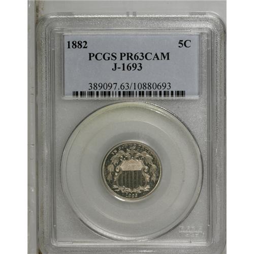 <B>1882 5C Shield Five Cents, Judd-1693, Pollock-1895, Low R.7, PR63 Cameo PCGS.</B></I> Similar to a regular issue proof Shield nickel, but no ball is present on the base of the shield. Struck in nickel with a plain edge. Sharply struck and beautifully preserved with light tan-gray toning. The fields have occasional minor retained laminations, as made. Population: 1 in 63, 5 finer (10/06).<BR><BR><b>Shipping:</b> Coin/Currency (<a target="_blank" href="http://www.heritageauctions.com/common/shipping.php">view shipping information</a>)