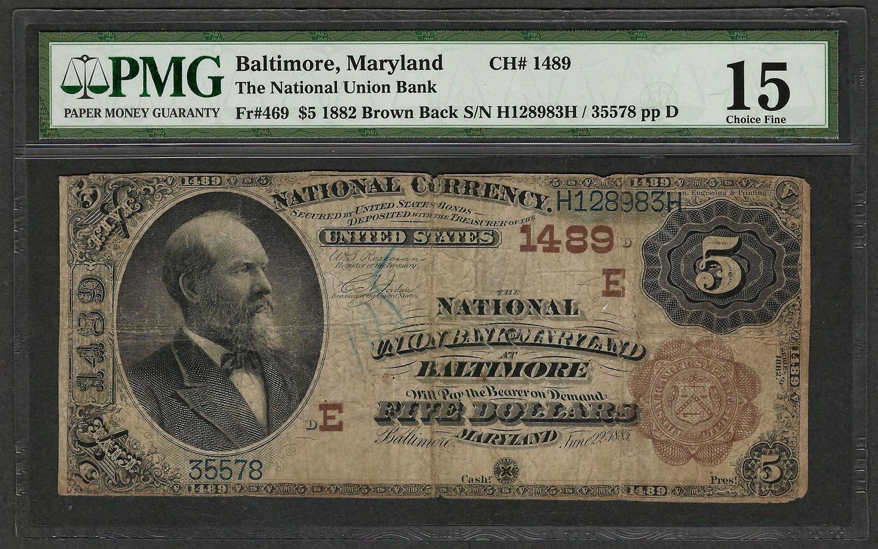 One 1882 BB $5 National Union Bank Baltimore, MD CH# 1489 Note PMG Choice Fine 15. PMG Certified.