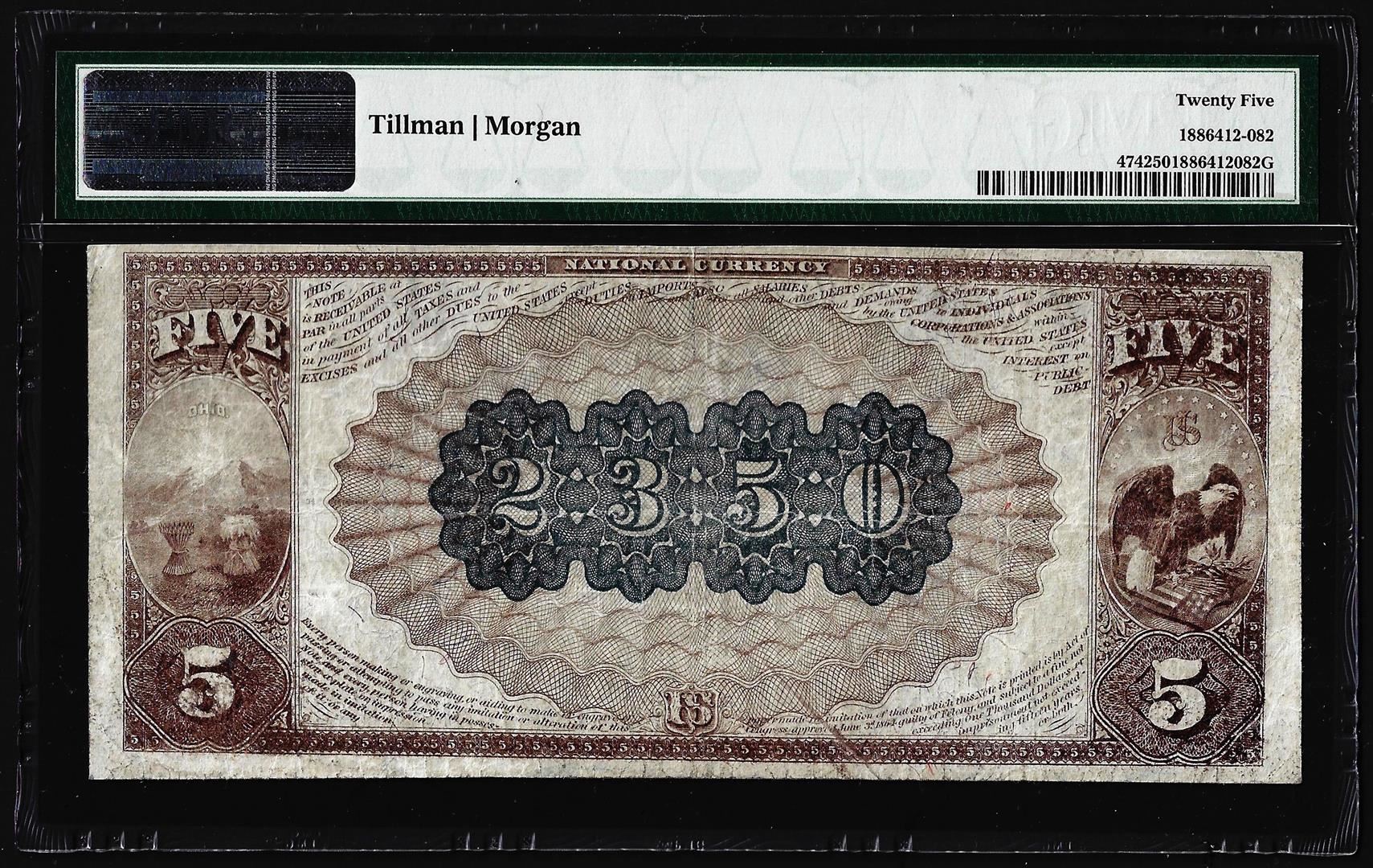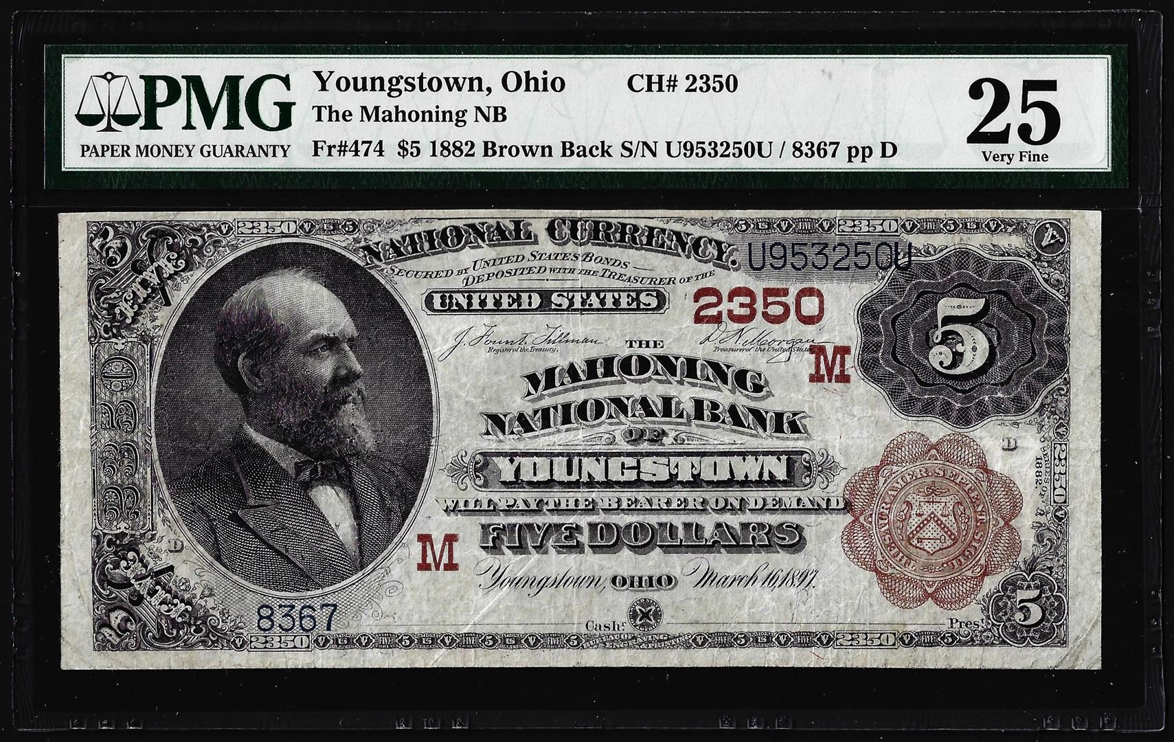 One 1882 BB $5 Youngstown, Ohio CH# 2350 National Currency Note PMG Very Fine 25. PMG Certified.