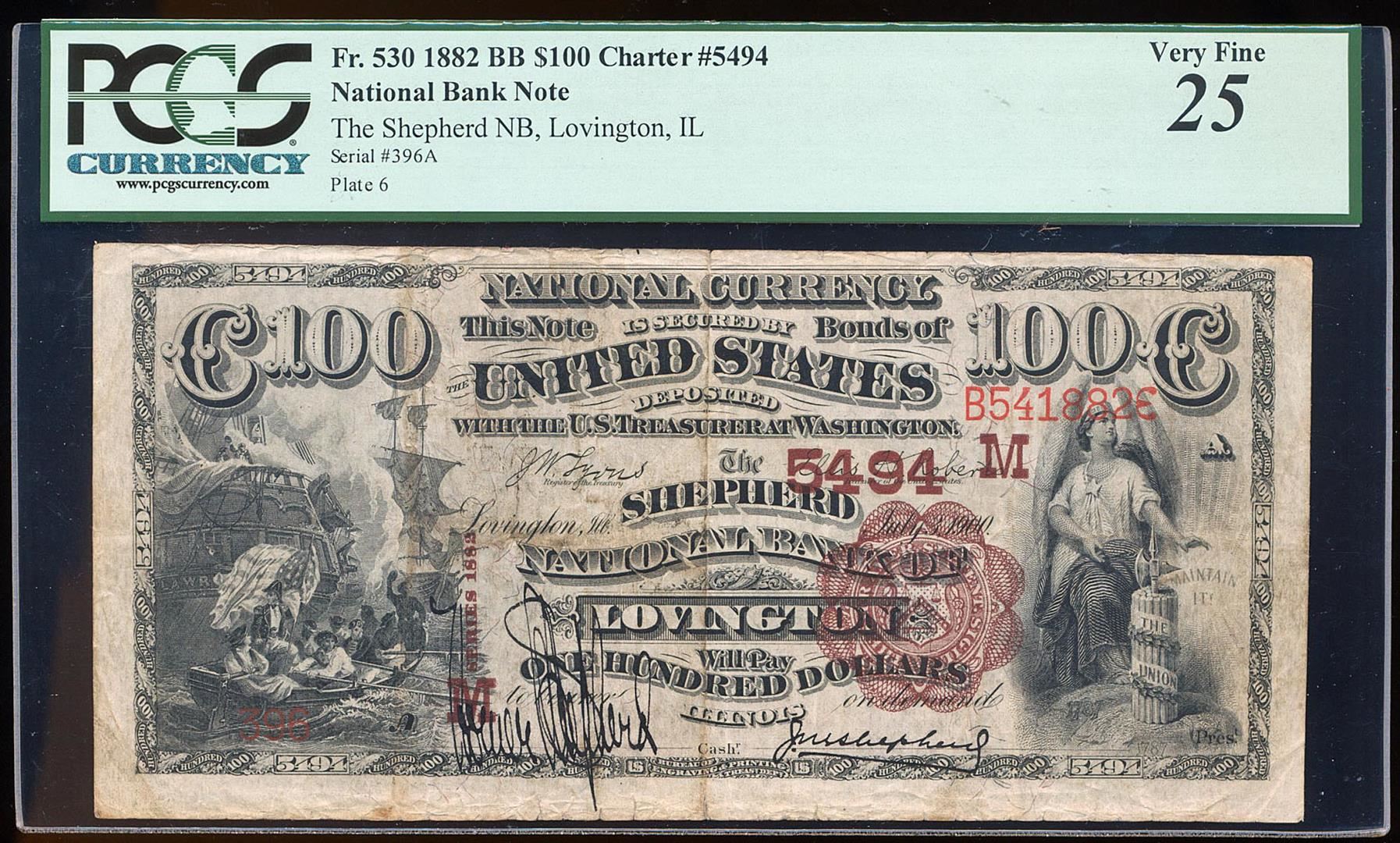 One 1882 Brown Back $100 Shepherd, IL National Currency Note Fr.530 PCGS Very Fine 25. This is unique for title, also a family owned bank which was signed by Shepherd and Shepherd. PCGS Graded.