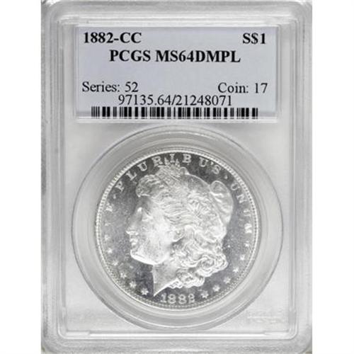 <B>1882-CC $1 MS64 Deep Mirror Prooflike PCGS.</B></I> PCGS Population (715/374). NGC Census: (283/88). Numismedia Wsl. Price for NGC/PCGS coin in MS64: $650. (#97135)<BR><BR><b>Shipping:</b> Coins & Currency (<a target="_blank" href="http://www.heritageauctions.com/common/shipping.php">view shipping information</a>)