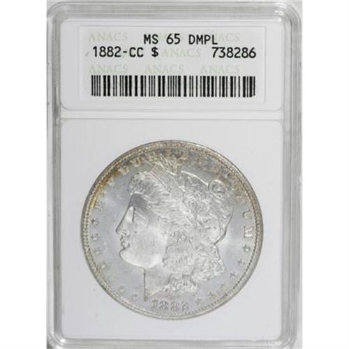 <B>1882-CC $1 MS65 Deep Mirror Prooflike ANACS.</B></I> NGC Census: (83/4). PCGS Population (311/60). Numismedia Wsl. Price for NGC/PCGS coin in MS65: $1,650. (#97135)<BR><BR><b>Shipping:</b> Coins & Currency (<a target="_blank" href="http://www.heritageauctions.com/common/shipping.php">view shipping information</a>)