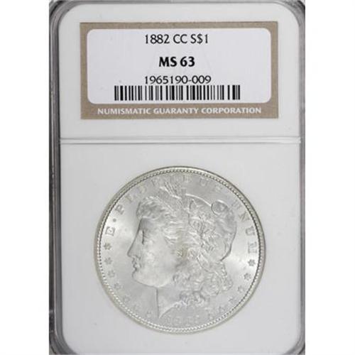 <B>1882-CC $1 MS63 NGC.</B></I> . NGC Census: (2271/6297). PCGS Population (5667/13393). Mintage: 1,133,000. Numismedia Wsl. Price for NGC/PCGS coin in MS63: $196. (#7134)<BR><BR><B>Coin Engraver:</B> George T. Morgan<BR><BR><b>Shipping:</b> Coins & Currency (<a target="_blank" href="http://www.heritageauctions.com/common/shipping.php">view shipping information</a>)